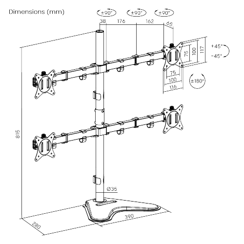 Built to support demanding multi-screen setups, this quad monitor arm delivers rock-solid stability with flexible, ergonomic positioning. It helps maximise desk space while allowing precise control over four displays through smooth height adjustment, wide tilt and swivel movement, and full rotation. Integrated cable management keeps everything clean and organised, making it ideal for high-productivity workspaces, control rooms, and professional multi-display environments.